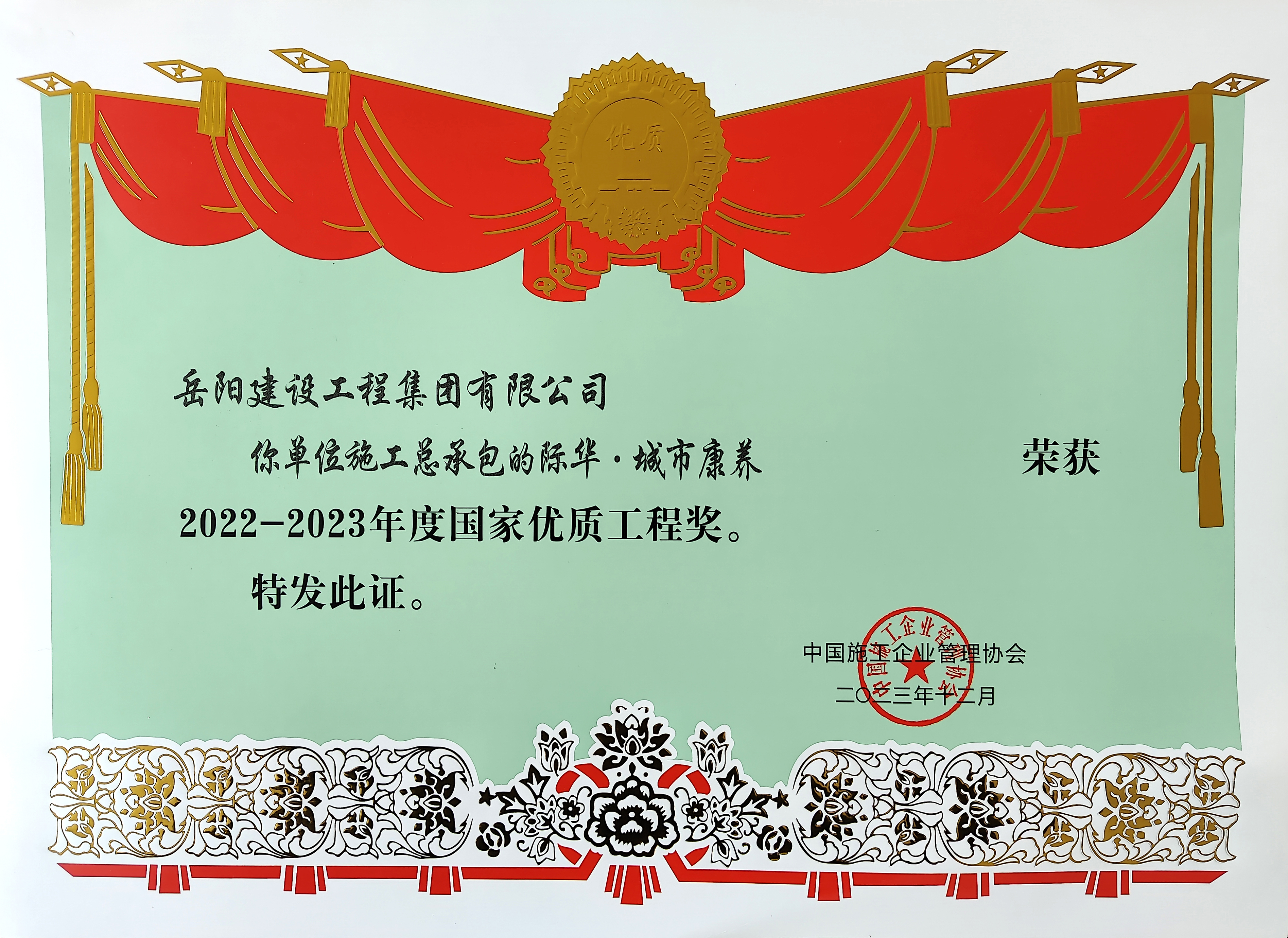 12月24日,2022—2023年度國家優(yōu)質(zhì)工程獎(jiǎng)總結(jié)表彰大會(huì)在北京召開。由公司承建的際華·城市康養(yǎng)項(xiàng)目和參建的仙桃市沔陽小鎮(zhèn)文化旅游項(xiàng)目喜獲“國家優(yōu)質(zhì)工程獎(jiǎng)”。
